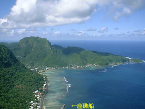 目の下にパゴパゴ湾が見える。パゴパゴ湾は、ツツイラ島が正式にアメリカの植民地となる前から、アメリカが捕鯨の補給基地として使っていたくらいの良港だが、岸近くはかなり浅瀬になっている。座礁した船が点々と10隻近く見える。