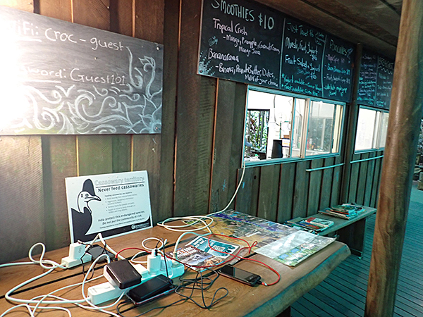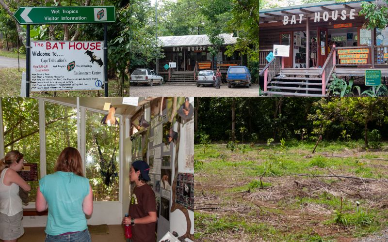 Rock Cafeほかいくつかのお店があって、にぎやかな観光地だが、このカフェの向かいのメイン道路沿いにメガネオオコウモリのコロニーがある。Hughさんのポスター発表を聞くと、熱帯雨林の中にもオオコウモリのコロニーはあるようだけど、こういうにぎやかなところが好きなコロニーもけっこういるようだ。以前は施設の一環としてBat Houseという一般向けの啓蒙施設があって、入り口がわかりやすくなっていたのだが、現在クイーンズランド州に営業を禁止されたということで、メイン道路からの入り口が目立たなくなっている。自然に帰せない傷病オオコウモリを教育用に見せているのはBat