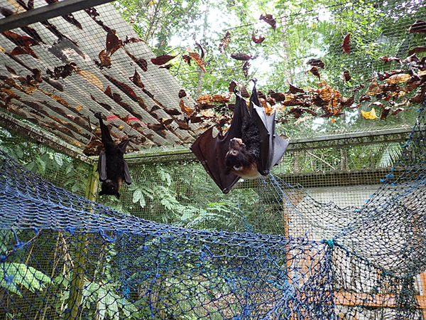 Houseなどの施設をたてたときは草地だったのを、少しずつ植生回復して林にしていたが、今では熱帯雨林が発達して、太陽発電がうまく働かないくらい繁っている。保護飼育中のメガネオオコウモリを2頭見せてもらった。