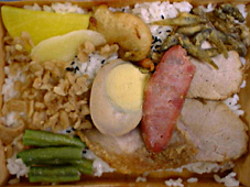 途中の駅で停車中にホームのお弁当売りから駅弁を買った。ここは、「峠の釜飯」みたいに駅弁で有名な場所で、駅弁ねらいでホームに降りる人がかなりいる。100元札を出すと10元コイン4枚のお釣りパックが用意されていて、パッと出してくれるところも峠の釜飯みたいだ。お弁当はあたたかく、経木につつまれているのが懐かしい。ご飯の上に直接ソーセージや煮卵や揚げ物がいろいろとのっかっていて、ご飯に味がしみていて、決して上品なものではないがおいしかった。「峠の釜飯」のように弁当自体に特色があるわけではないようだ。