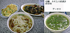 お昼を過ぎたので、近くの食堂の様子を見に行った。一軒のお店で中を覗いているわれわれに向かって、お店の人が注文票を振ってこれに書けばいいというようなジェスチャーをして見せている。しゃべれない日本人だとわかったのだろうか。なんだかわからない黒くて歯ごたえのあるもの(ナマコかな?)と葉っぱとトウガラシ、ショウガ、ニンニクのぶつ切りがたっぷり入った炒め物、沖縄にもあるカツオブシのたっぷり入った丼入りのアーサ汁、切麺というのは肉のそぼろが入った平べったいうどん風の麺だった。ねぎ入りの卵焼きはカニ玉からカニを抜いたようなもの。計115元