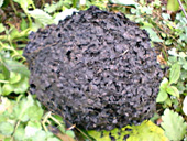 今日は火焼山に向かう。この島はもともと火焼島という名称だったのを1949年に緑島に改名した。だから火焼山はまさにこの島を代表する山である。標高わずか280mであるが、標高0mから登るのだから、意外と登りでがある。空港近くから山に入る舗装道路がある。あまり農業は盛んでないようだが、サツマイモやピーナツ、サトウキビが植わっている畑の間を通る。道路際にはイヌホオズキやクワズイモ、アカバナボロギク、カンナの野生種など、沖縄の道ばたと共通の植生が見られる。木の枝の又になったところに、黒いボール状のアリの巣があった。風で道路に落ちてしまったものも結構ある。墜落して間もないと思われるものは、中でアリが右往左往している。(左の画像)