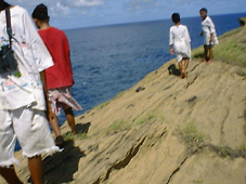 me one dollar"と口々に言う。自分だけでもいいからよこせというやつもいる。 アメリカンサモアの子供たちは、こんな離島でも小さな子供までみごとにバイリンガルで、お互いに話しているときはサモア語、われわれに向かって話すときは英語と楽々と切り替えている。何度言われても"No!"なのだが、この後外輪山をぐるっと回って海が見えるところまで、しつこく金くれと言われながら歩いていく。目の前をグンカンドリが飛んでいく。