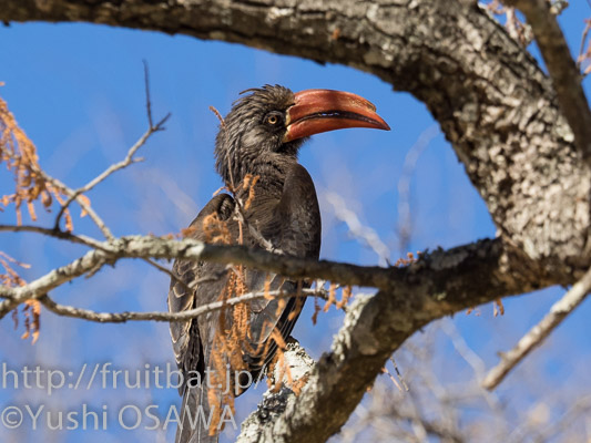 サイチョウは何種類かいるようだ。これはカンムリコサイチョウCrowned Hornbill Tockus alboterminatus