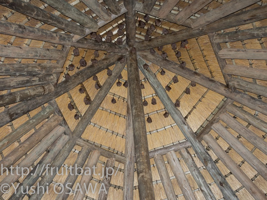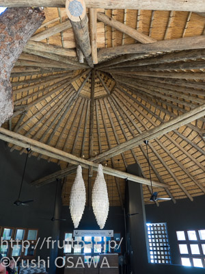 空港の建物の一部は草葺きだ。このロビーの草葺き屋根の内側に、ケンショウコウモリが50頭ほどねぐらをとっていた。まだ預けた荷物も受け取っていない。コウモリを見に行ってコウモリと出会った最速記録だ。真下には当然糞が落ちていて、人が通るし荷物がおいてあったりするのだが、誰も気にしていないようだ。
