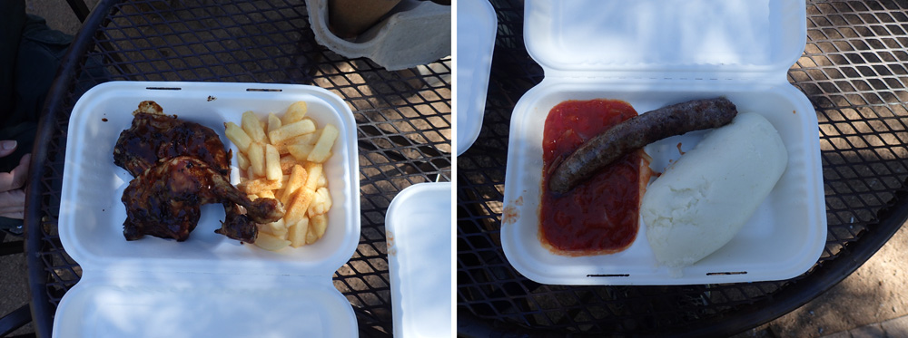 テイクアウトのお店はよく利用した。ちょっと味付けが濃い。右は南アフリカの料理のpap(トウモロコシ粉をお湯で溶いて煮たもの) and boerewors(ソーセージ) papはタンザニアでウガリといって似たような味のものを食べた。