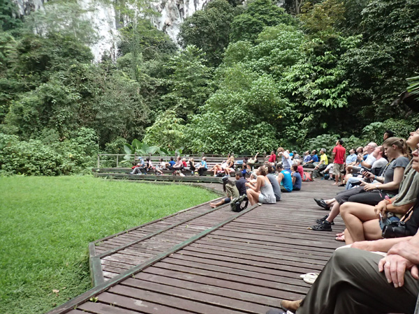 17時頃この観察台にいくと既に座っている人がまばらにいる。洞くつツアーは受付前を14時に出発するグループと14時半に出発するグループがあるのだが、早いほうのグループがそろそろ洞窟からでてきて観察台にくわわる。17時半過ぎまで次々と洞窟からでてきて、また歩いてくる人もいてだんだん観察台がいっぱいになっていく。