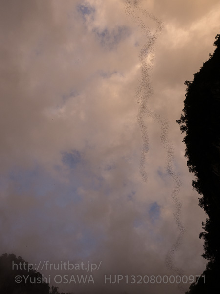 出巣は17時52分から、昨日よりずっとたくさんでた。うねうねとして長く空に上がっていく大きなグループの出巣も見られた。18時15分頃まで次々とみられる。ピークを過ぎるとお客さんは次々と帰っていく。西の空が明るくなって洞窟の上の崖に夕陽がしばらく当たる。空は昨日も今日もびっしり雲に覆われているのだが、少し切れ目ができて青空も見られた。