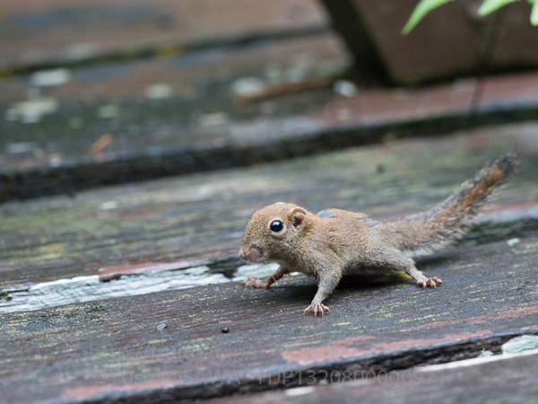 翌早朝もディアケイブの観察台まで朝6時10分に行ってみたが、あいかわらずコウモリは見られなかった。とうとう朝は実りがなかった。この日は誰もいない観察台にボルネオコビトリスが20頭くらいいて、観察台の木の床を走り回って追いかけっこをしたり手すりの上を走ったりしていた。再び洞窟からコケアナツバメが次々出巣するのが見られるがコウモリの姿はない。6時50分頃から霧が濃くなってきて洞窟の入口が見えなくなってやがて雨が降ってきたので帰ることにした。