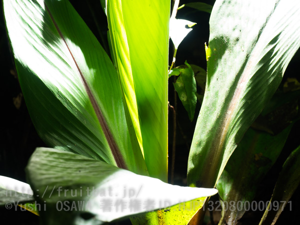 昨日のバナナの葉のコウモリをがどうなったか見に行ったら、既に葉が開いていた。少なくとも5頭が昨夜はねぐらにしていたわけだが、その名残に糞がついている。