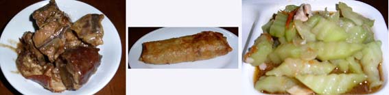 夕食はホテルのカフェで豚肉を甘く煮付けたもの、青いパパイヤとトマトの煮物、もやしの入った春巻きなど。