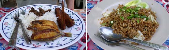 途中の簡易食堂でお昼ご飯、ナシゴレン(マレーシア風チャーハン)、ご飯に魚の開きを揚げたものとチキンソースをのせた経済飯、フレッシュオレンジジュースとリンゴジュースで11.5リンギット。
