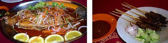 夕食は近くのマレーシア風中華のお店へ行く。マレーシアはマレー系の人以外に中国系の人も多く、ランカウイは比較的中国系が少ないそうだが、中華料理店はいたるところにある。中国からかと思われる一団のグループが、送迎車で来ていた。サテーという串焼き肉にピーナッツソースをつけたもの8本6.8リンギット、600gの揚げた魚36リンギット、青梗菜の炒め物8リンギット、ご飯1.5リンギットに冷たいウーロン茶0.5リンギット二つずつで、しめて53.8リンギット。日本円にすると1800円弱だが、我々にしては豪華な夕食となった。