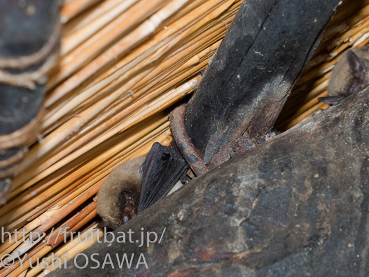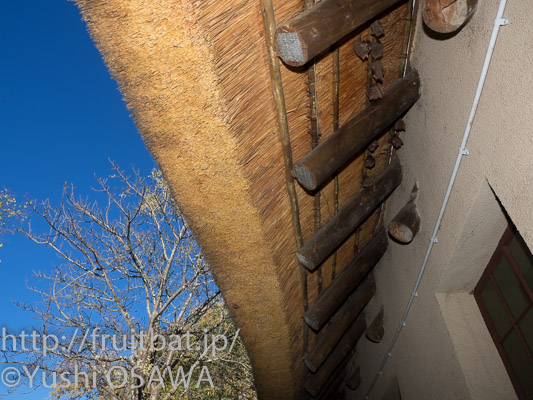 昼間コウモリの糞が落ちているのを見つけた、売店の近くにあるキャンプキッチンの梁と草葺き屋根の隙間には、2-3頭コウモリの顔がのぞいていたが、何度か写真を撮ったら引っ込んでしまった。アフリカイエローハウスコウモリScotophilus dinganiiではないかと思われる。