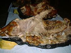 パーティには子豚の丸焼きがつきもの。きれいに花を飾ってあります。後ろは舟盛りの刺身。レモンとしょうゆとトウガラシの入ったフィナデニソースをつけて食べます。右は子ブタ使用中。
